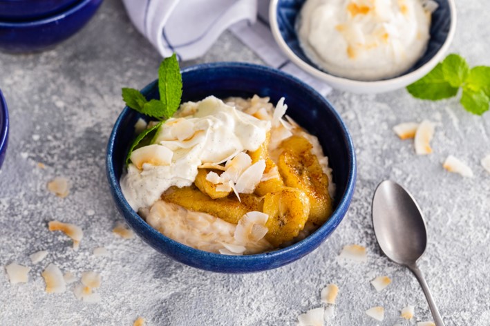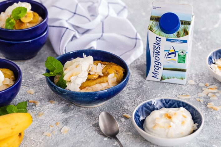 Ryż nakładamy do miseczek, następnie dokładamy plasterki bananów i krem maślankowy. Całość dekorujemy chipsami z kokosa lub wiórkami kokosowymi..