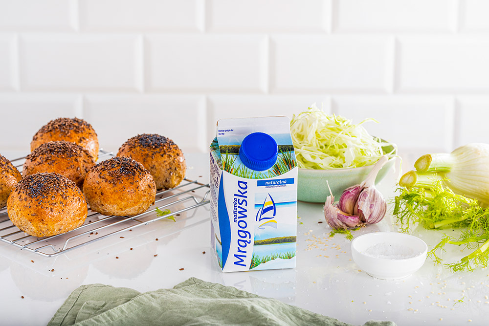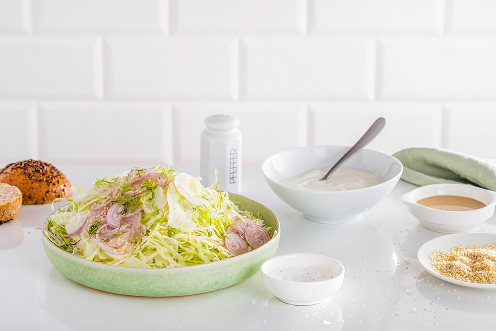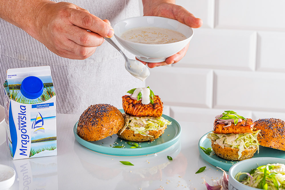 Pozbawiony skóry kawałek łososia myjemy i osuszamy, następnie skrapiamy oliwą, przyprawiamy solą oraz pieprzem. Tak przygotowanego łososia przyprawiamy wędzoną papryką i nacieramy harissą, odstawiamy na ok. 30 minut. W miseczce mieszamy jogurt z maślanką i dodajemy przeciśnięty przez praskę ząbek czosnku, sok z cytryny oraz tahinę. Całość dokładnie mieszamy i odstawiamy na bok. Białą kapustę szatkujemy na cienkie kawałki do miski, podobnie postępujemy z fenkułem. Następnie dodajemy pokrojona w piórka szalotkę, posiekany koperek oraz nać z kopra włoskiego. Całość dokładnie mieszamy, dodajemy oliwę z oliwek i przyprawiamy solą oraz pieprzem. Ponownie wszystko mieszamy i dodajemy prażony sezam. Łososia grillujemy na patelni po kilka minut z obu stron. Bułki kroimy na pół, dolną część smarujemy sosem z maślanką i nakładamy na nią surówkę z kapusty. Następnie układamy na surówkę kawałek łososia i posiekaną w piórka szalotkę oraz pokrojony szczypior. Całość polewamy sosem.