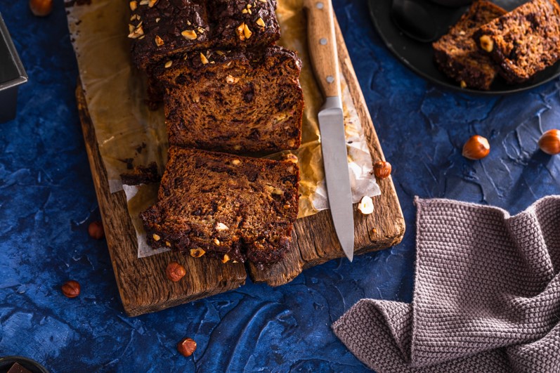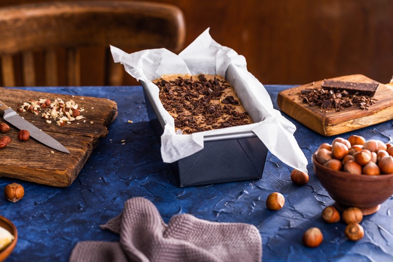 Masę dokładnie mieszamy i przelewamy do formy o wymiarach 11cm na 21cm wyłożonej papierem do wypieków, wierzch ciast posypujemy posiekanymi orzechami i czekoladą. Tak przygotowaną formę wkładamy do piekarnika nagrzanego do 180 stopni i pieczemy przez ok. 75 minut.