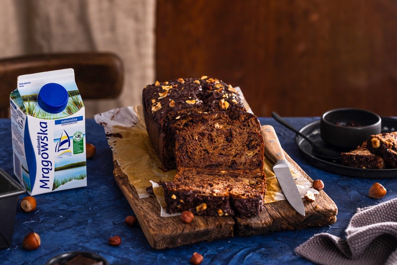 W większej misce przy pomocy widelca rozgniatamy banany na mniejsze kawałki, następnie dodajemy maślankę, szczyptę soli, mąkę i roztrzepane jajka oraz masło. Do powstałej masy dodajemy sodę oczyszczoną i cynamon. Orzechy laskowe siekamy drobno nożem, podobnie jak gorzką czekoladę – następnie dzielimy je w proporcji 1/3 do 2/3 i większe części wrzucamy do miski z masą, a mniejsze pozostawiamy do posypania na wierzch ciasta.