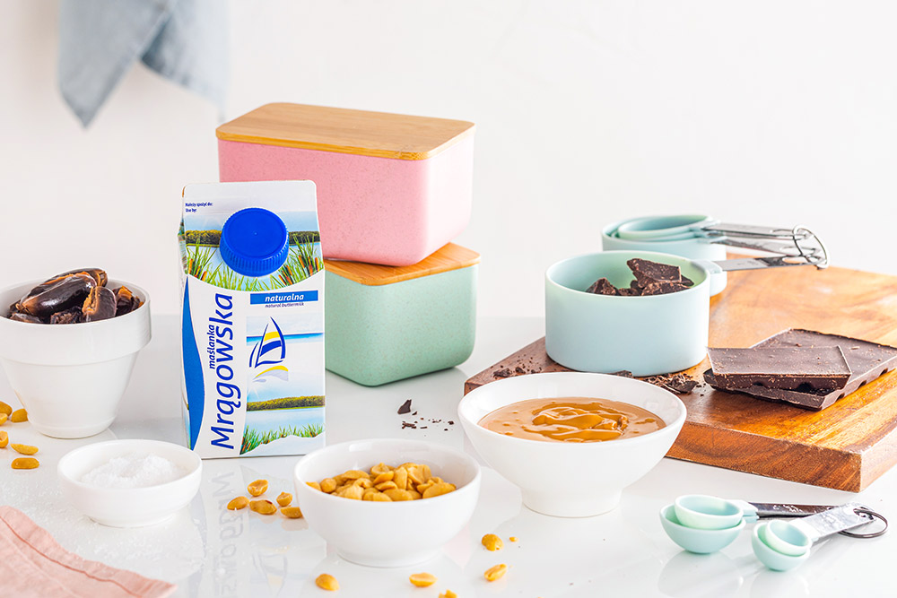 Do kielicha blendera wlewamy Maślankę Mrągowską i śmietankę kremówkę oraz miód. Następnie dodajemy posiekane daktyle oraz szczyptę soli, całość dokładnie miksujemy. Dodajemy masło orzechowe i ponownie miksujemy.