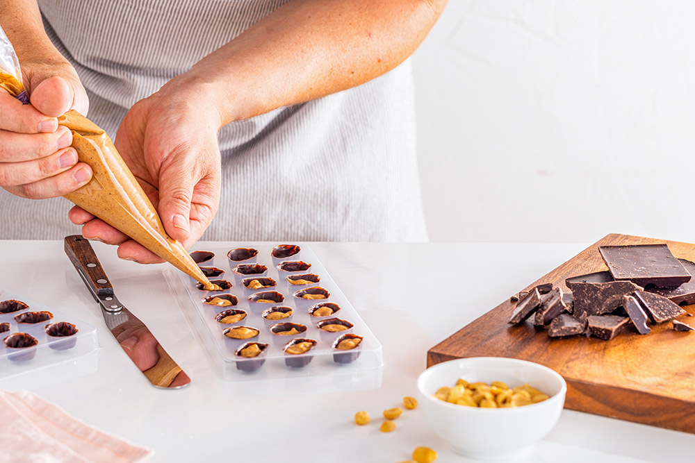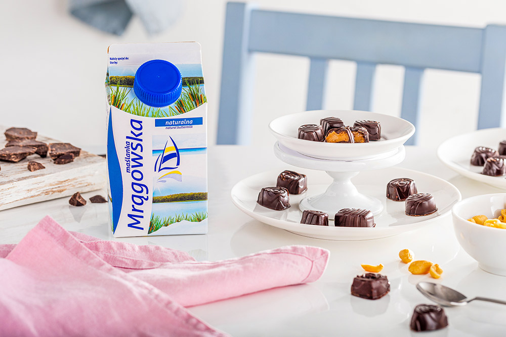 Po wyjęciu foremek z lodówki napełniamy je wcześniej powstałą masą przy pomocy np. rękawa cukierniczego. Na wierzch foremek rozlewamy płyną czekoladę i ściągamy jej nadmiar przy pomocy szpatułki. Tak przygotowane foremki z czekoladkami ponownie schładzamy w lodówce i później wyciągamy czekoladki z foremki.