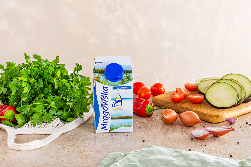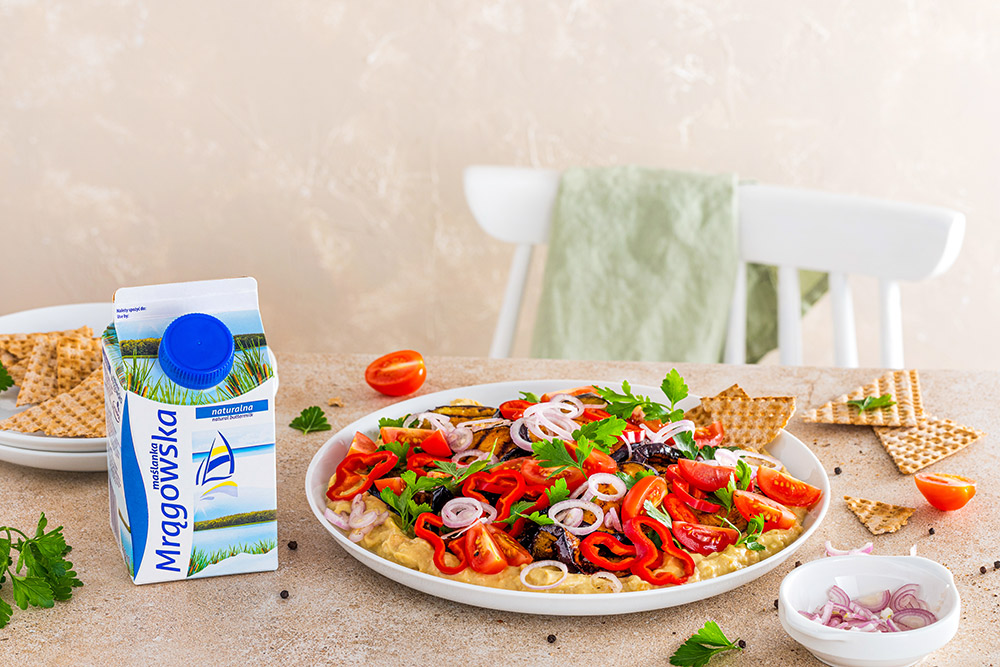 Dip z humusu i maślanki rozsmarowujemy na talerzu, następnie układamy na nim grillowane plastry bakłażana. Później układamy pokrojone w połówki lub ćwiartki pomidorki koktajlowe oraz kawałki świeżej papryki, natkę pietruszki i szalotkę. Całość skrapiamy sokiem z cytryny i podajemy ze świeżym pieczywem lub macą.