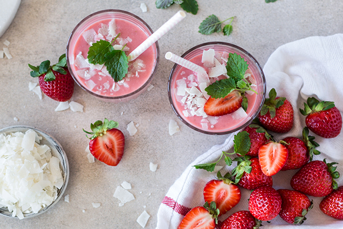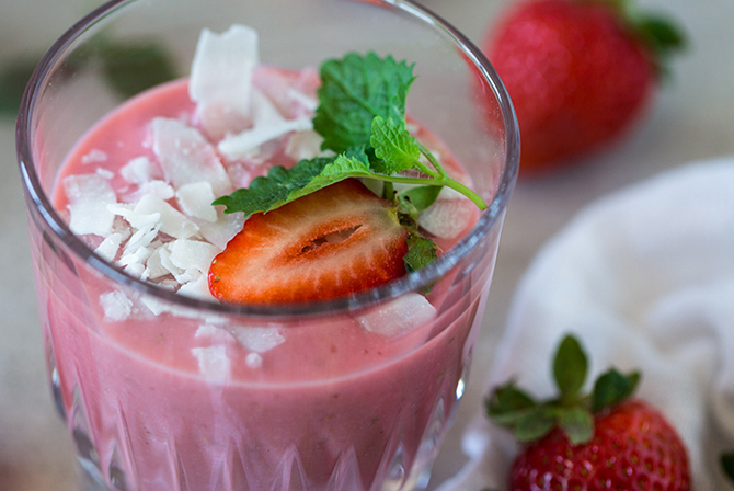 Jakie śniadanie, taki cały dzień. Zacznij go na słodko i różowo. Połączenie truskawek, wiórków kokosowych i maślanki to orzeźwienie, które rano przyda się każdemu. truskawka