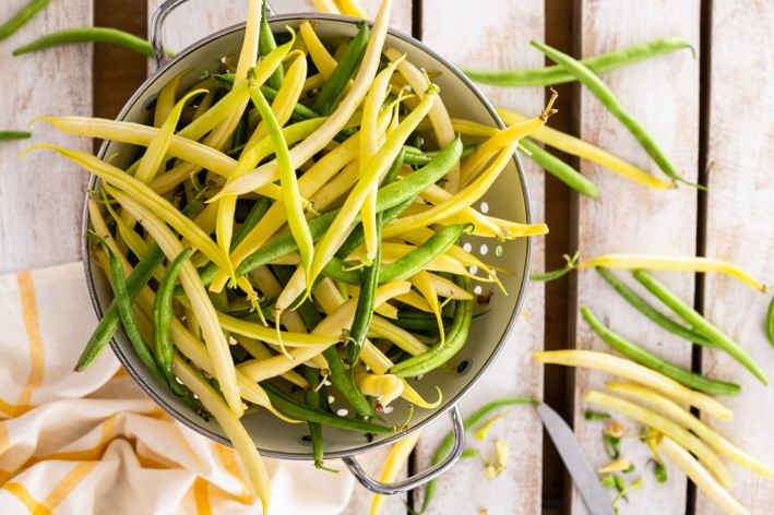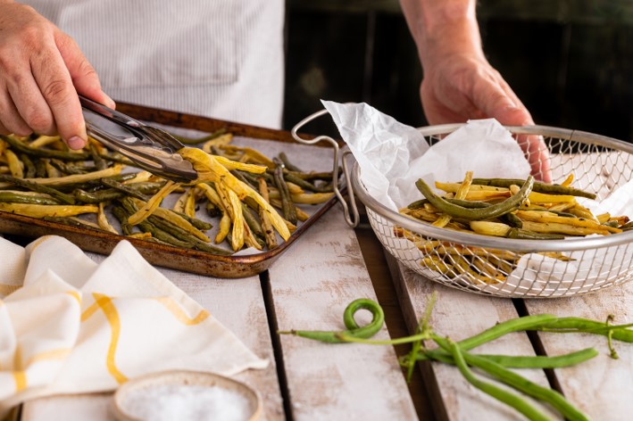 Z fasolki szparagowej pozbywamy się końcówek przy pomocy noża, następnie fasolkę myjemy i osuszamy. Przekładamy ją do większej miski, dodajemy suszone płatki chili i tymianek. Dodajemy oliwę z oliwek oraz sól, następnie wszystko dokładnie mieszamy i wykładamy na dwie blaszki do pieczenia. Wkładamy do piekarnika nagrzanego do 180 stopni z termoobiegiem i pieczemy ok. 35minut lub do lekkiego zbrązowienia.
