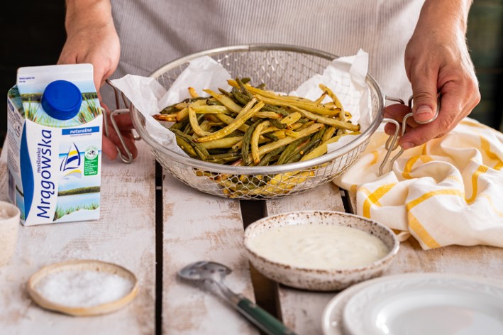 Maślankę mieszamy z jogurtem i musztardą, następnie dodajemy suszone oregano i przeciśnięty przez praskę czosnek. Dip doprawiamy do smaku solą i dokładnie mieszamy.