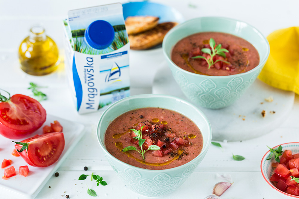 Pomidory sparz, obierz i pokrój na ćwiartki. Przełóż do garnka, dodaj pokrojoną paprykę oraz bazylię, kilka listków oregano, chili, przeciśnięty przez praskę czosnek i całość dokładnie zmiksuj. Dodaj maślankę, dopraw solą, pieprzem i cukrem. Dokładnie wymieszaj.