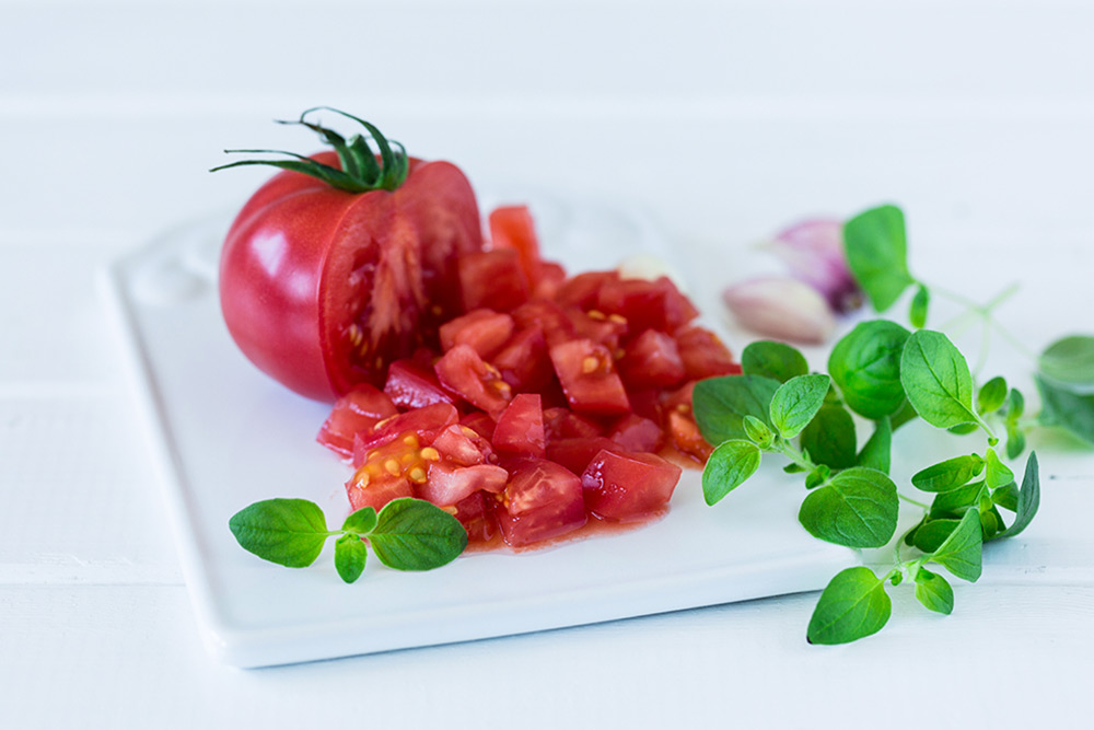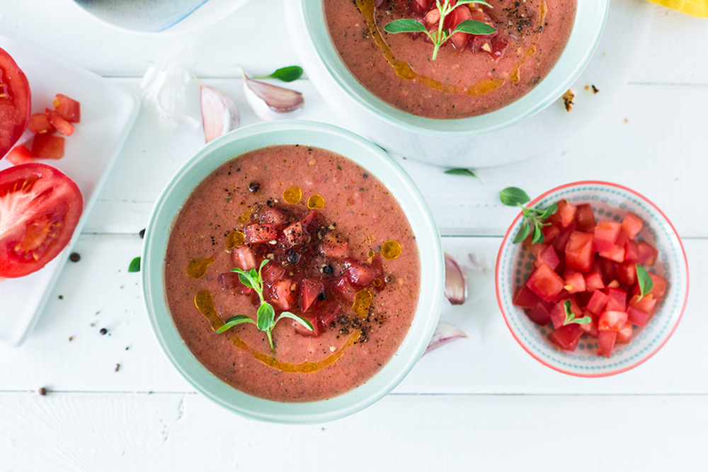 Pomidora do salsy obierz, drobno pokrój i wymieszaj z oliwą. Dodaj listki oregano i dopraw pieprzem. Chłodnik przelej do miseczek, na wierzch dodaj pomidorową salsę i udekoruj listkami oregano.