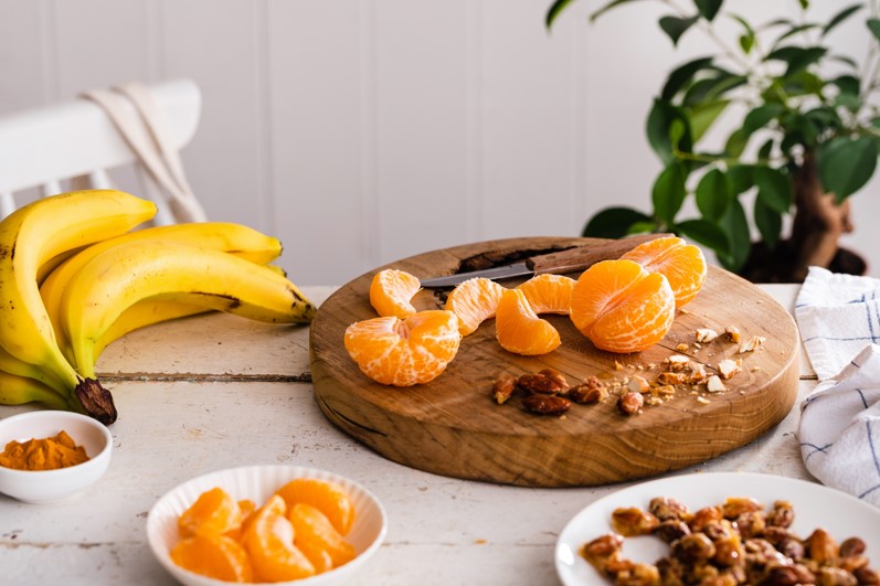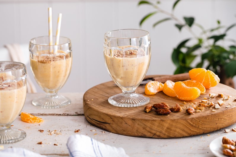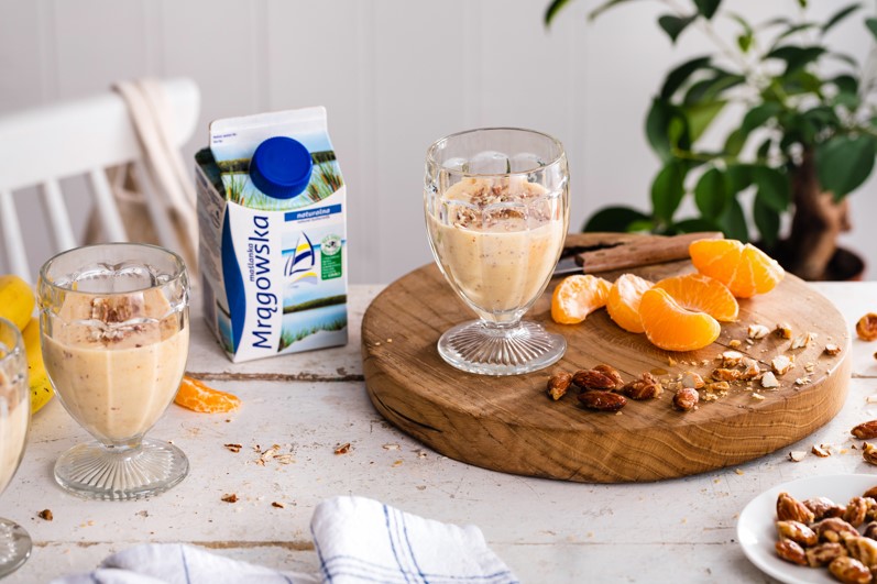 Do kielicha blendera wlewamy maślankę, dodajemy banana i obrane wcześniej mandarynki. Przyprawiamy kurkumą i dodajemy przestudzone migdały. Całość miksujemy na gładką masę i nalewamy do szklanek.