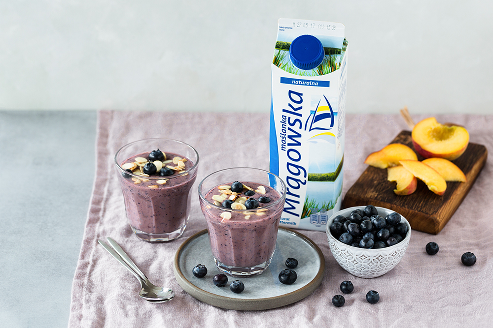Maślankowy koktajl wypełniony owocami postawi na nogi nawet największego śpiocha. Borówki i brzoskwinie w połączeniu z maślanką, migdałami i odrobiną wyrazistego imbiru tworzą śniadanie idealne.