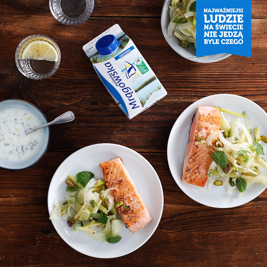 Sałatkę podawaj z rybą i dresingiem maślankowym.