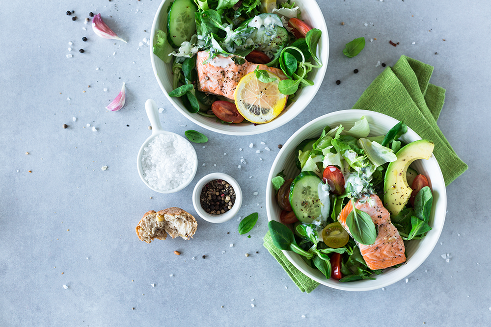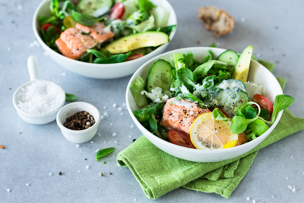 Całość wymieszaj i połącz z warzywami. Sałatkę wyłóż na talerze, a na niej ułóż upieczone porcje