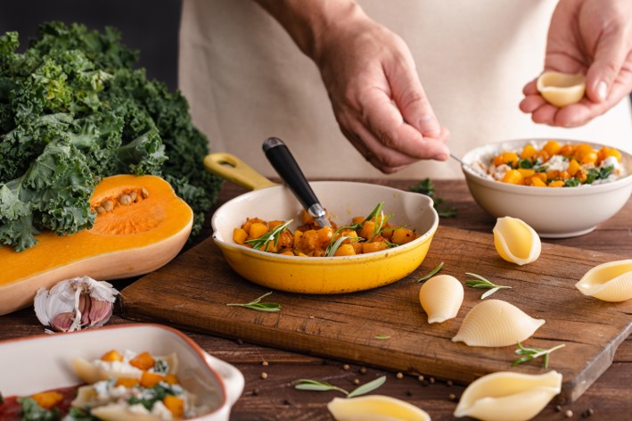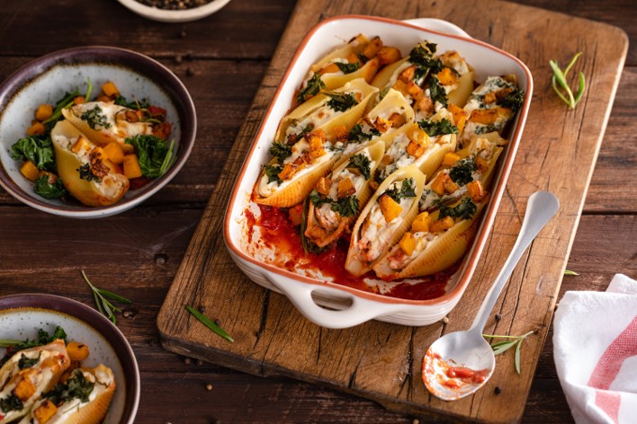 Na spód naczynia do zapiekania wylewamy passatę pomidorową, dodajemy przeciśnięty przez praskę czosnek, świeży rozmaryn, sól i pieprz do smaku, mieszamy całość. Następnie układamy nafaszerowane muszle makaronowe i na górę układamy liście jarmużu i kawałki dyni.