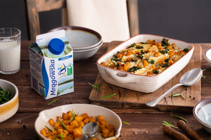 W misce mieszamy maślankę razem z ricottą, dodajemy poszarpane liście jarmużu, przestudzoną dynie i przyprawiamy solą oraz pieprzem. Tak powstałą masą faszerujemy muszle makaronowe.
