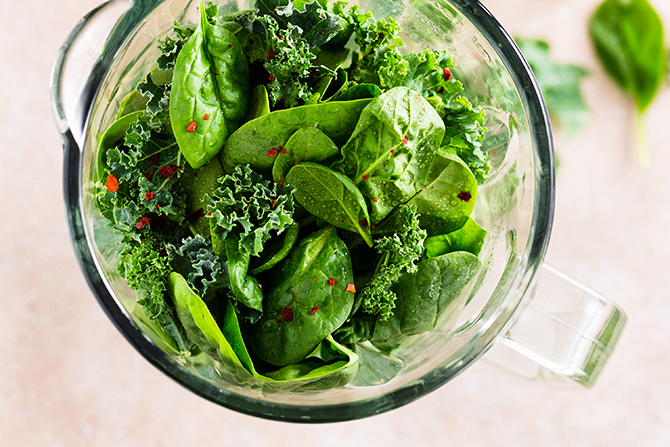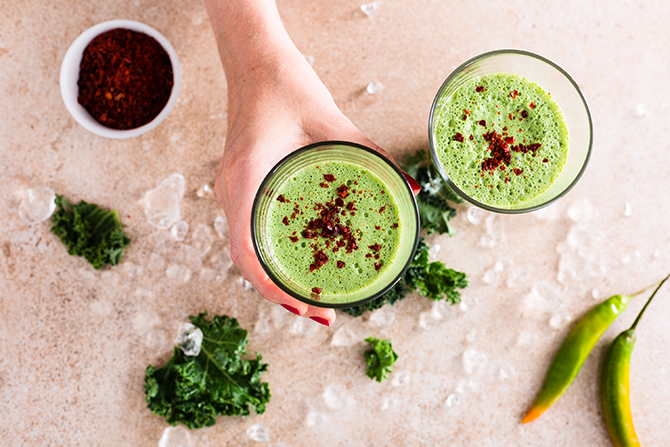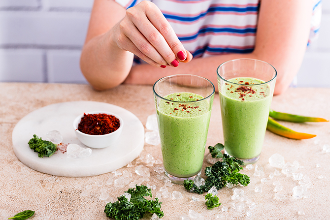 Szpinak i jarmuż umyj i osusz. Wszystkie składniki dokładnie zmiksuj w blenderze z Maślanką Mrągowską. Jeśli lubisz ostre przyprawy, porcje koktajlu możesz dodatkowo udekorować odrobiną pieprzu cayenne.