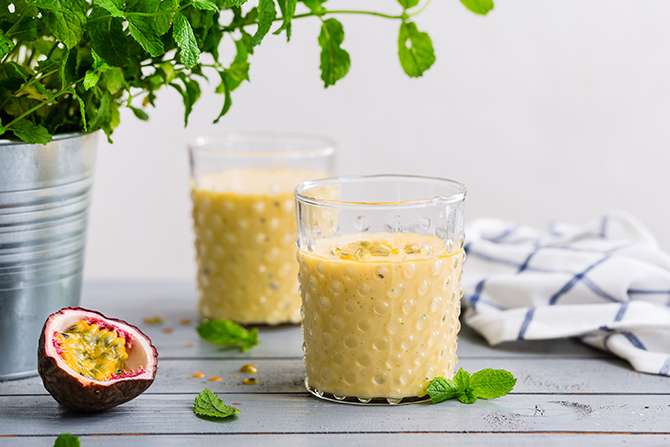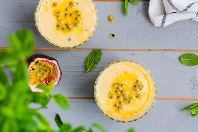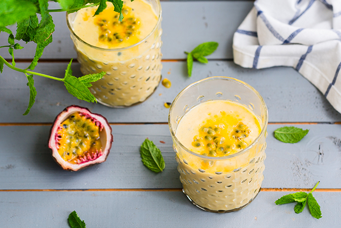 Mango obierz i odkrój miąższ od pestki. Marakuje przekrój i wyjmij łyżeczką miąższ z pestkami. Wszystkie składniki umieść w blenderze i zmiksuj na gładki koktajl. Opcjonalnie, przy większej ilości Maślanki Mrągowskiej, możesz dodać banana, by koktajl był bardziej treściwy i gęstszy.