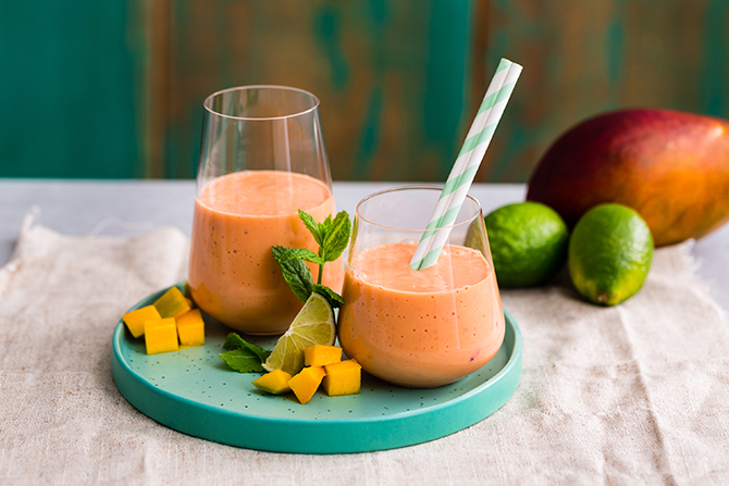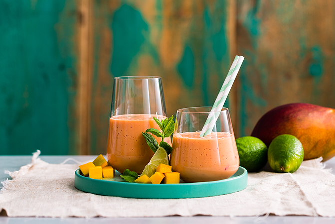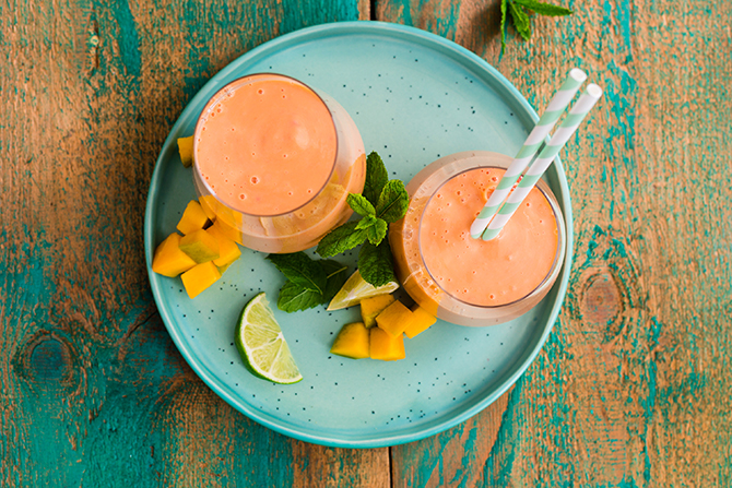 Mango obierz i odkrój miąższ od pestki. Morele umyj i pokrój. Wszystkie składniki umieść w blenderze i zmiksuj na gładki koktajl. W zależności od dojrzałości owoców, możesz dosłodzić koktajl miodem.