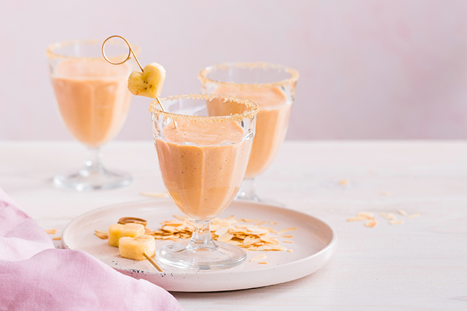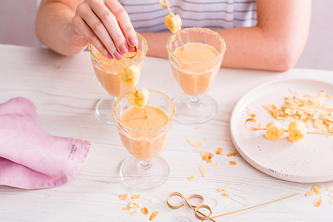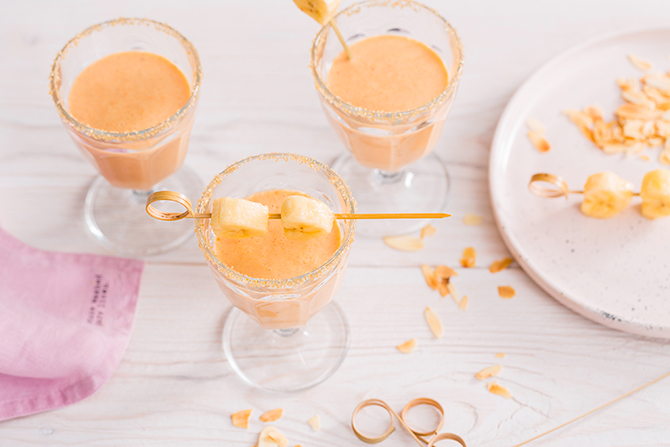 Banana i marchewki obierz i pokrój. Płatki migdałowe upraż na złoto, na suchej i dobrze rozgrzanej patelni. Odstaw do wystygnięcia. Marchewki, płatki i Maślankę Mrągowską umieść w blenderze i zmiksuj. Następnie dodaj pozostałe składniki i jeszcze chwilę miksuj, by uzyskać jednolity koktajl.