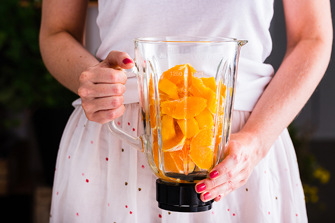 Pomarańcze dokładnie obierz i podziel na cząstki. Mango obierz i odkrój miąższ od pestki. Wszystkie składniki włóż do blendera, dodaj sok i Maślankę Mrągowską, zmiksuj na gładki koktajl.