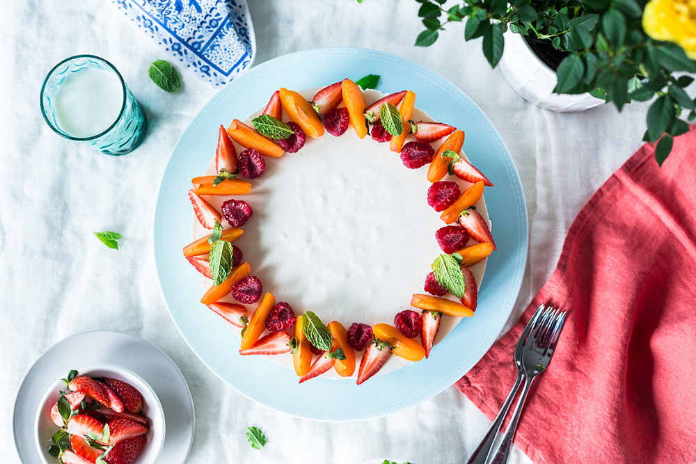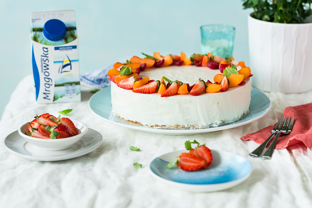 Gotowe ciasto udekoruj świeżymi owocami i ziołami.