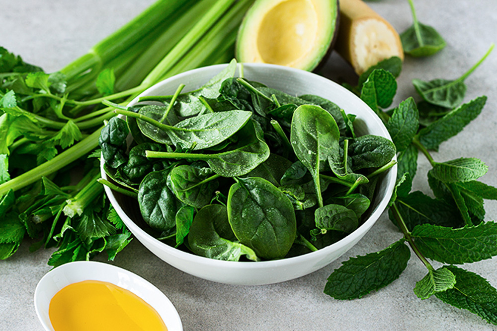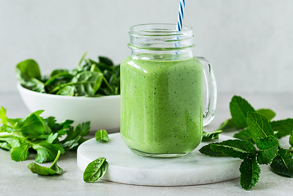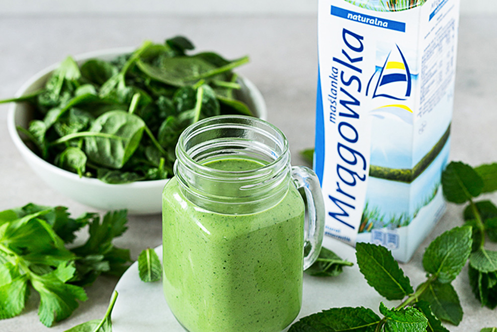 Liście szpinaku opłucz i przełóż do wysokiego naczynia. Dodaj obrane i pokrojone awokado, obranego banana i pokrojonego selera. Całość zalej maślanką, dopraw miodem i imbirem. Zmiksuj na gładko, przelej do szklanki i udekoruj miętą.