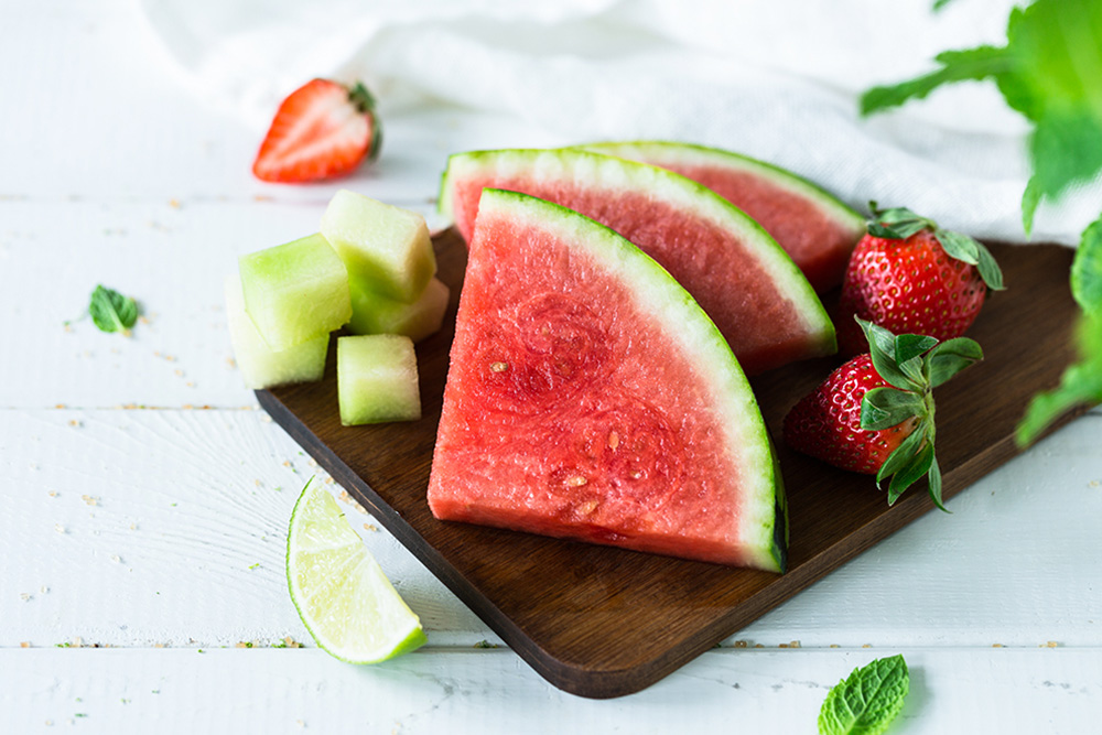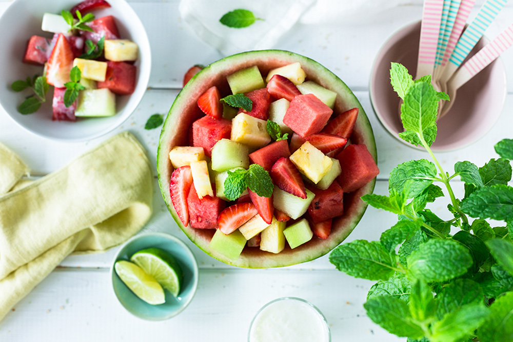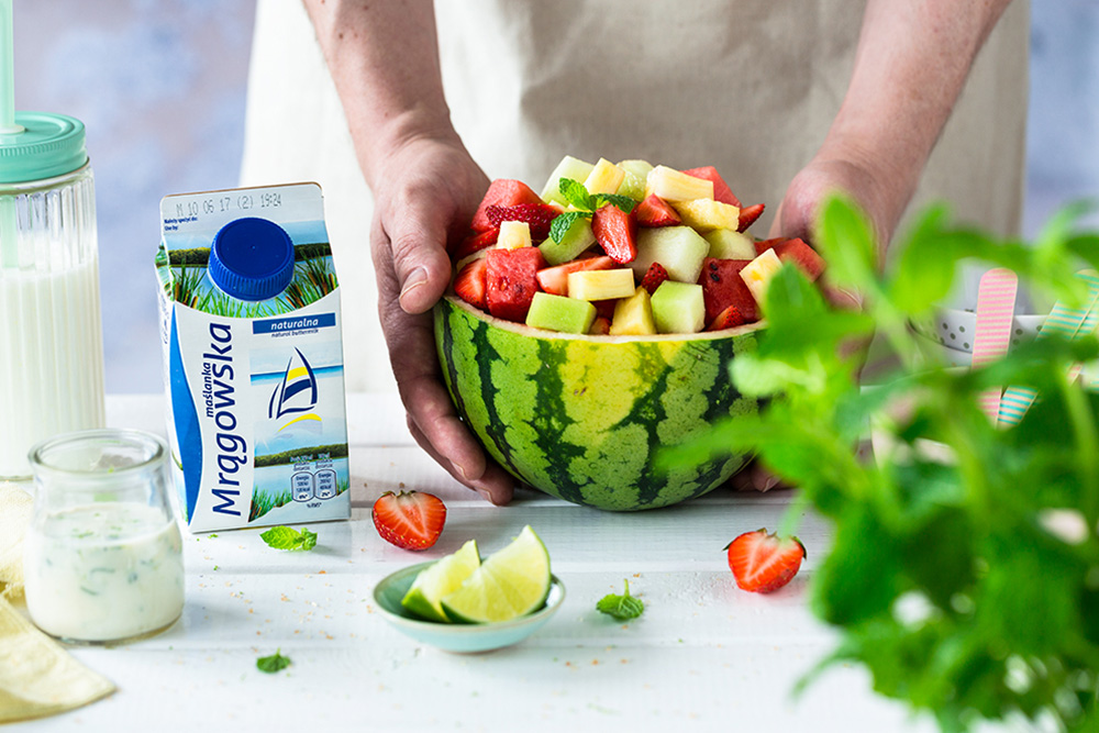 Umyte i pozbawione szypułek truskawki pokrój na ćwiartki. Arbuza wydrąż, a miąższ pokrój w kostkę. Melona i ananasa obierz, również pokrój w kostkę. Przełóż owoce do miski. Maślankę przelej do miseczki, dodaj skórkę z limonki, cukier i posiekane listki mięty. Całość dokładnie wymieszaj i polej sosem owoce. Podawaj w wydrążonej połówce arbuza. Udekoruj listkami mięty.