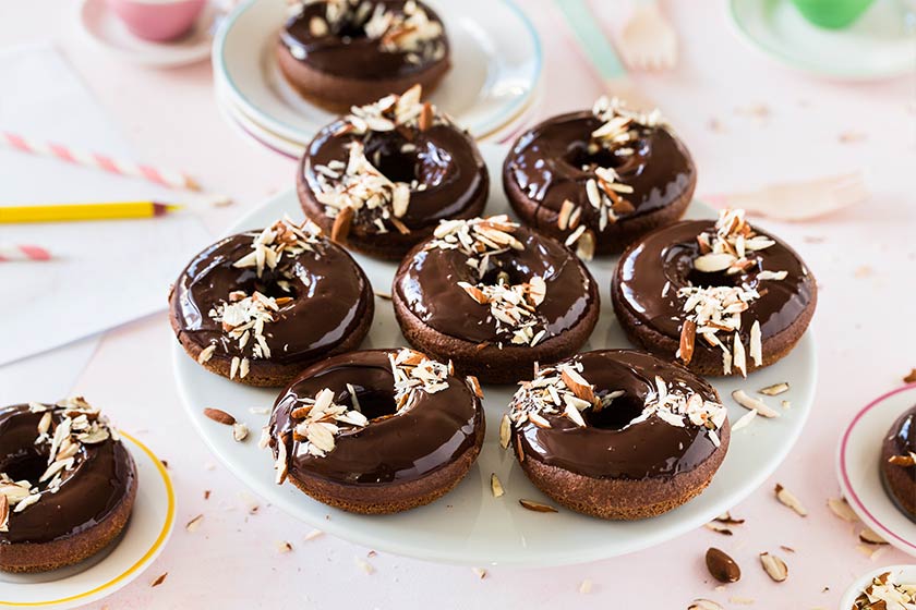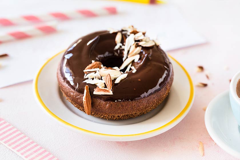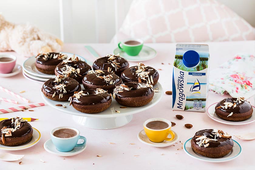 rękawa cukierniczego, a następne napełnij formę do pieczenia donutów (forma powinna być lekko nasmarowana olejem). Piecz ok. 20-25 minut w piekarniku nagrzanym do 200°C. Po upieczeniu wyjmij donuty z formy i odstaw do przestudzenia. W tym czasie rozpuść czekoladę w kąpieli wodnej i posiekaj migdały. Maczaj donuty w czekoladzie i dekoruj migdałami.