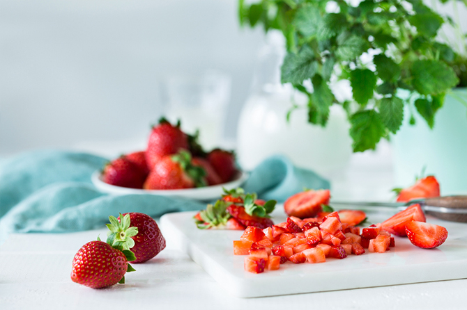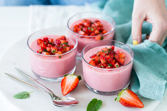 Truskawki umyj, osusz, odetnij szypułki i pokrój w kostkę. Zalej owoce maślanką, dodaj cukier puder i ekstrakt waniliowy. Zmiksuj na jednolitą masę. Żelatynę rozpuść we wrzącej wodzie, po przestudzeniu dodaj do zmiksowanych truskawek z maślanką i energicznie wymieszaj. Gotową galaretkę przelej do wybranych naczyń i odstaw do zastygnięcia. Udekoruj truskawkami pokrojonymi w kosteczkę z listkami mięty lub melisy.