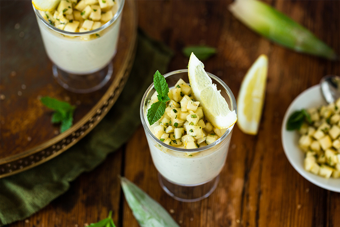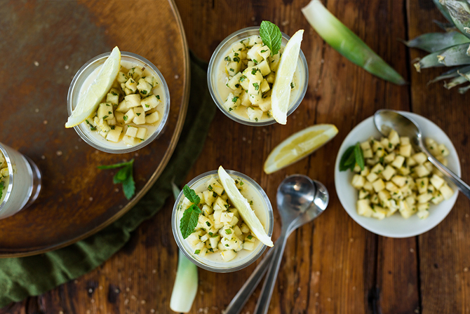 Następnie dodaj maślankę, wymieszaj dokładnie. Gotową masę przelej do szklanek, kieliszków, miseczek lub foremek i odstaw do lodówki na kilka godzin, do zastygnięcia. Pokrojonego ananasa wymieszaj z sokiem i skórką cytryny, posiekanymi listkami mięty i cukrem. Podawaj z panna cottą.