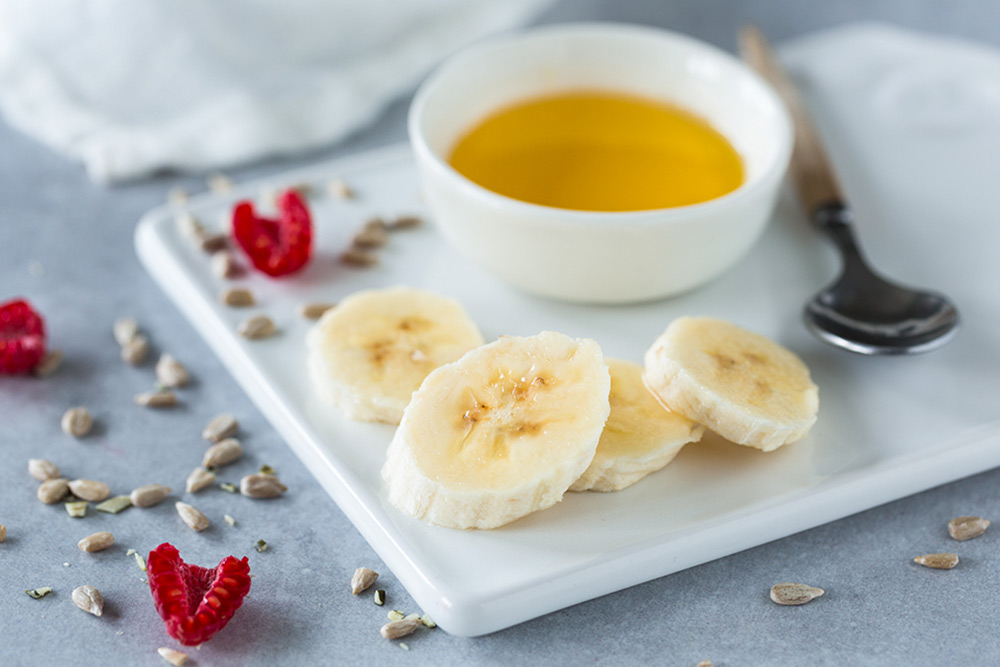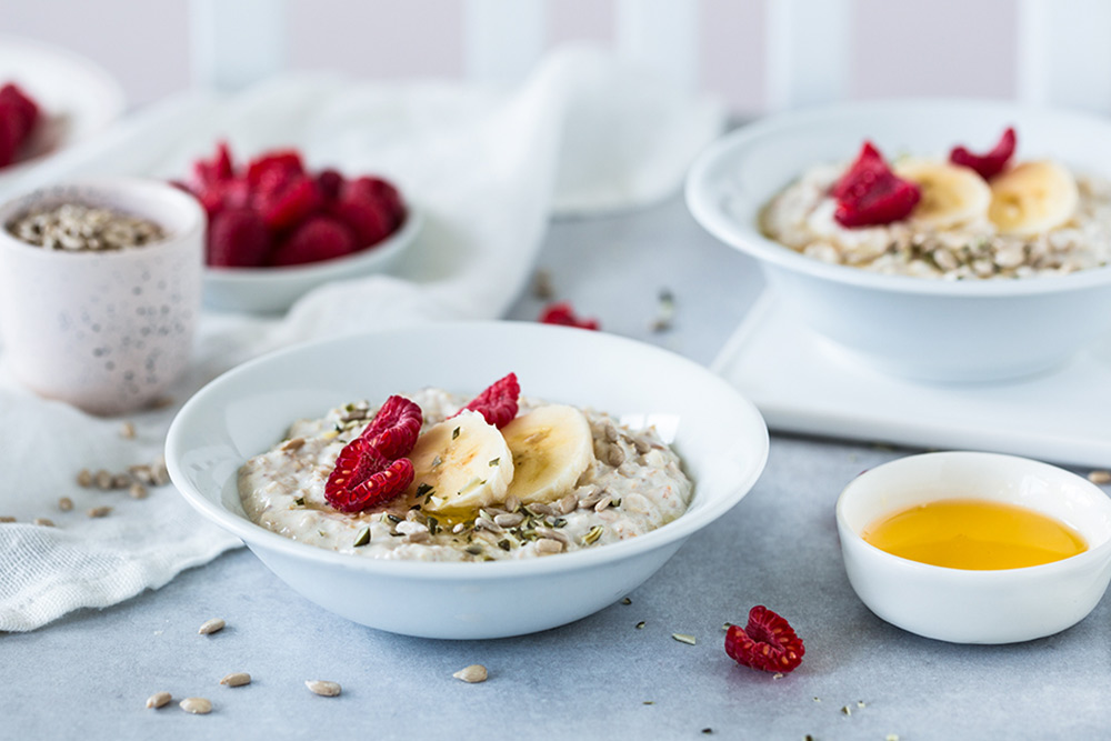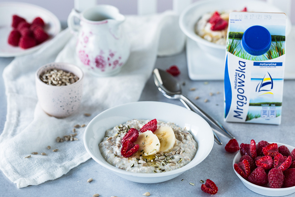 Płatki wsyp do miski, zalej maślanką, przykryj i odstaw na noc do lodówki. Następnego dnia rano dodaj cukier lub miód i tyle maślanki, aby uzyskać odpowiednią dla siebie konsystencję. Podawaj owsiankę w miseczkach, udekorowaną malinami i pokrojonym w plasterki bananem. Wierzch posyp posiekanymi pestkami dyni i pestkami słonecznika.