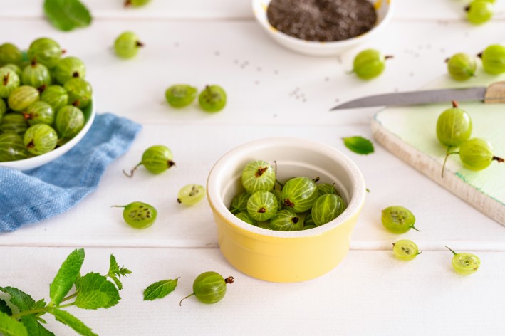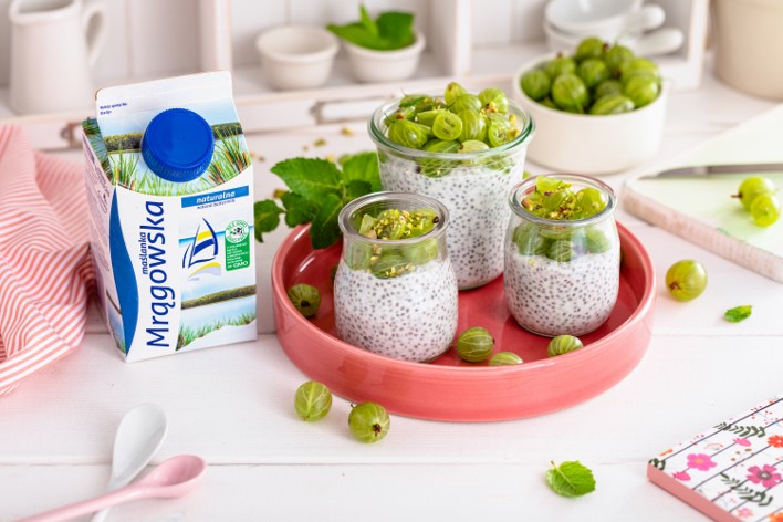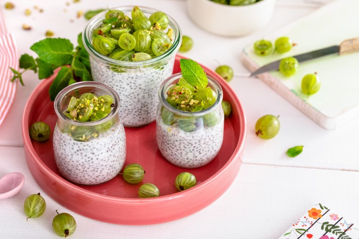 Tak przygotowane chia przekładamy do mniejszych naczyń, podajemy z agrestem, posiekanymi pistacjami, świeżymi listkami mięty. Wierzch skrapiamy syropem z agawy.
