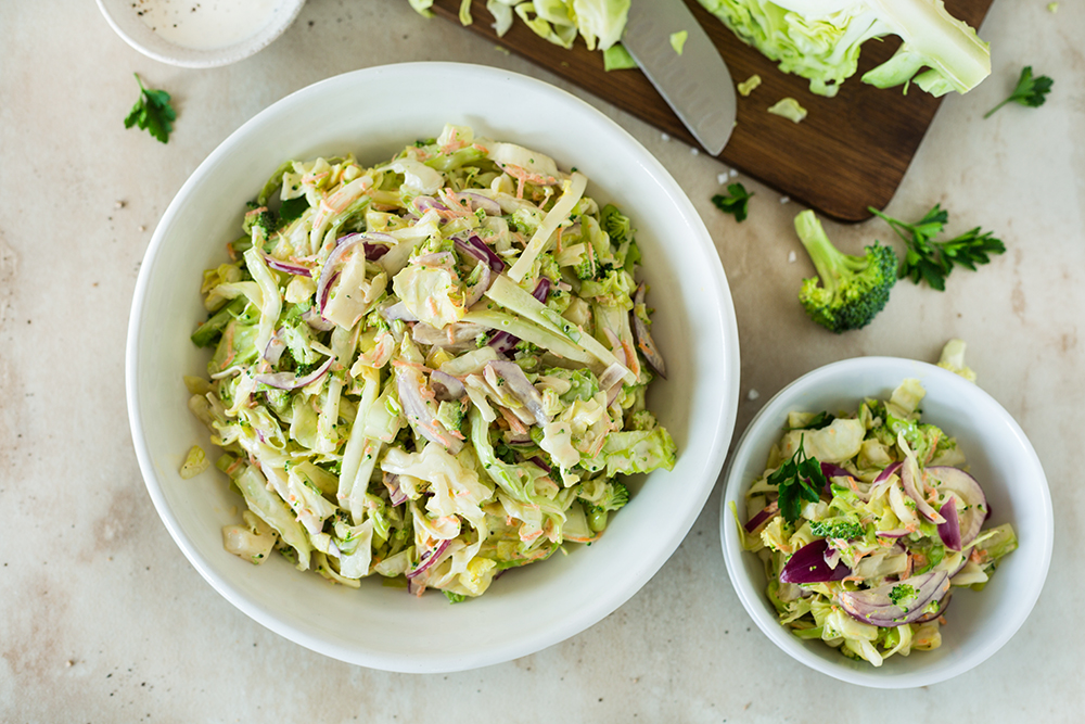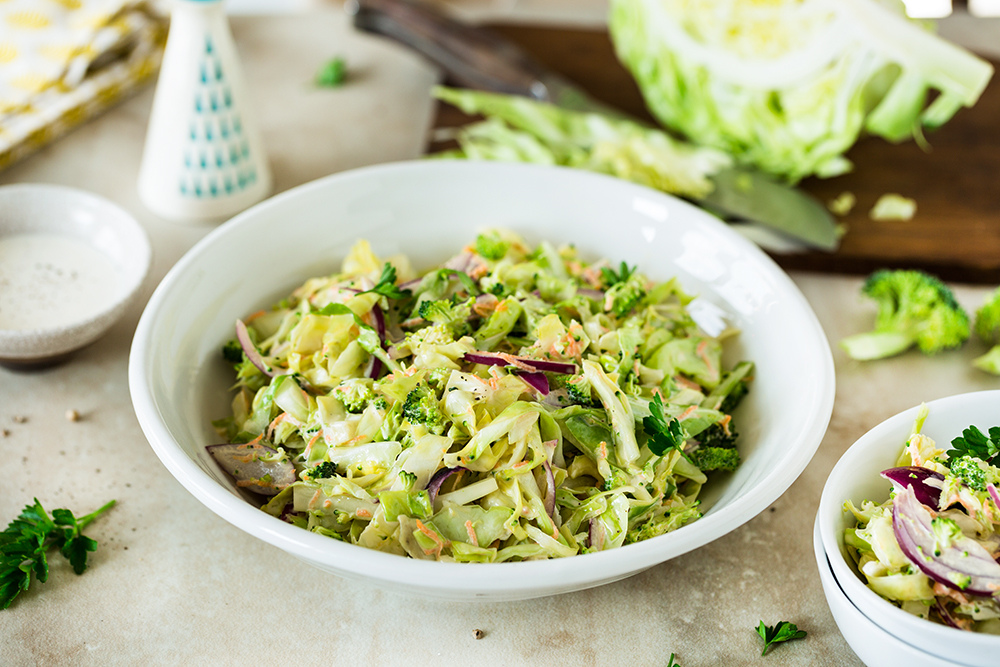 paseczki. Wszystkie warzywa przełóż do miski, dodaj posiekaną natkę, majonez i maślankę, dopraw