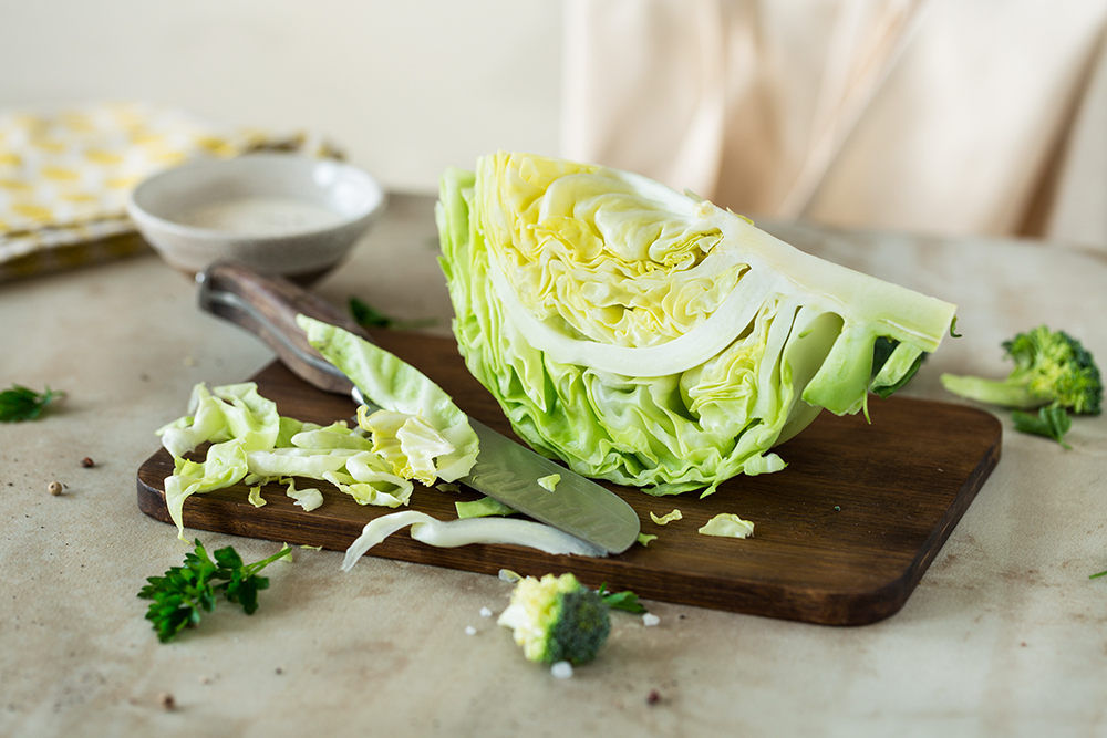 Kapustę drobno poszatkuj lub zetrzyj na tarce o grubych oczkach. Cebulę obierz i pokrój w piórka,