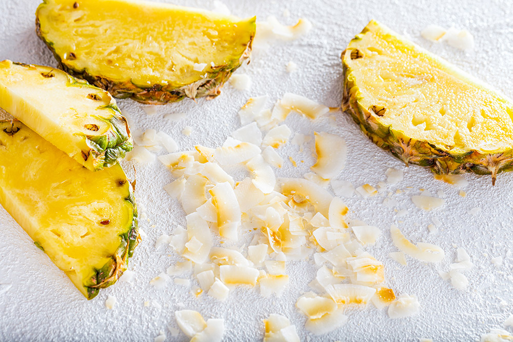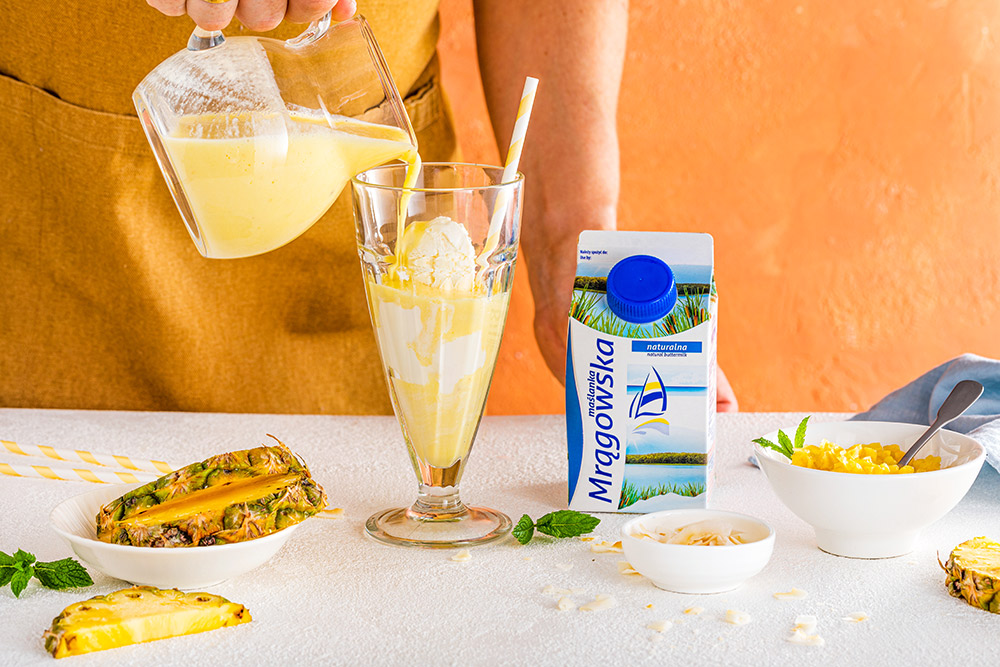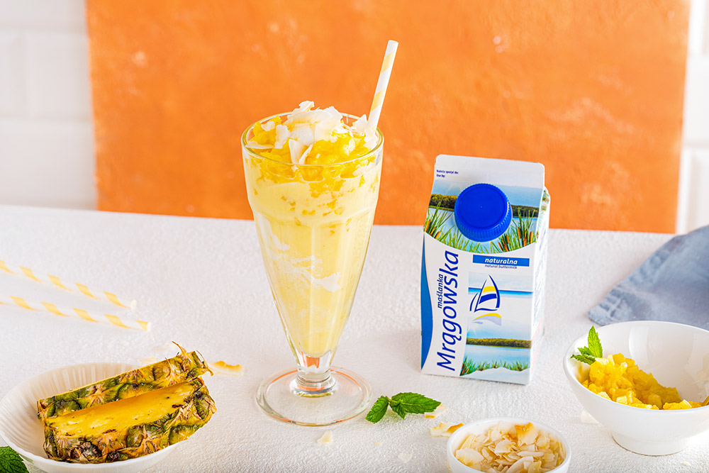 Do kielicha blendera nalewamy maślankę mrągowską i nakładamy 2 gałki lodów, następnie dodajemy kawałki ananasa i miód oraz ekstrakt waniliowy. Całość dokładnie miksujemy i przelewamy do szklanek. Na wierzch shake'a nakładamy nakładamy gałkę lodów i posiekany drobno ananas oraz płatki kokosa.