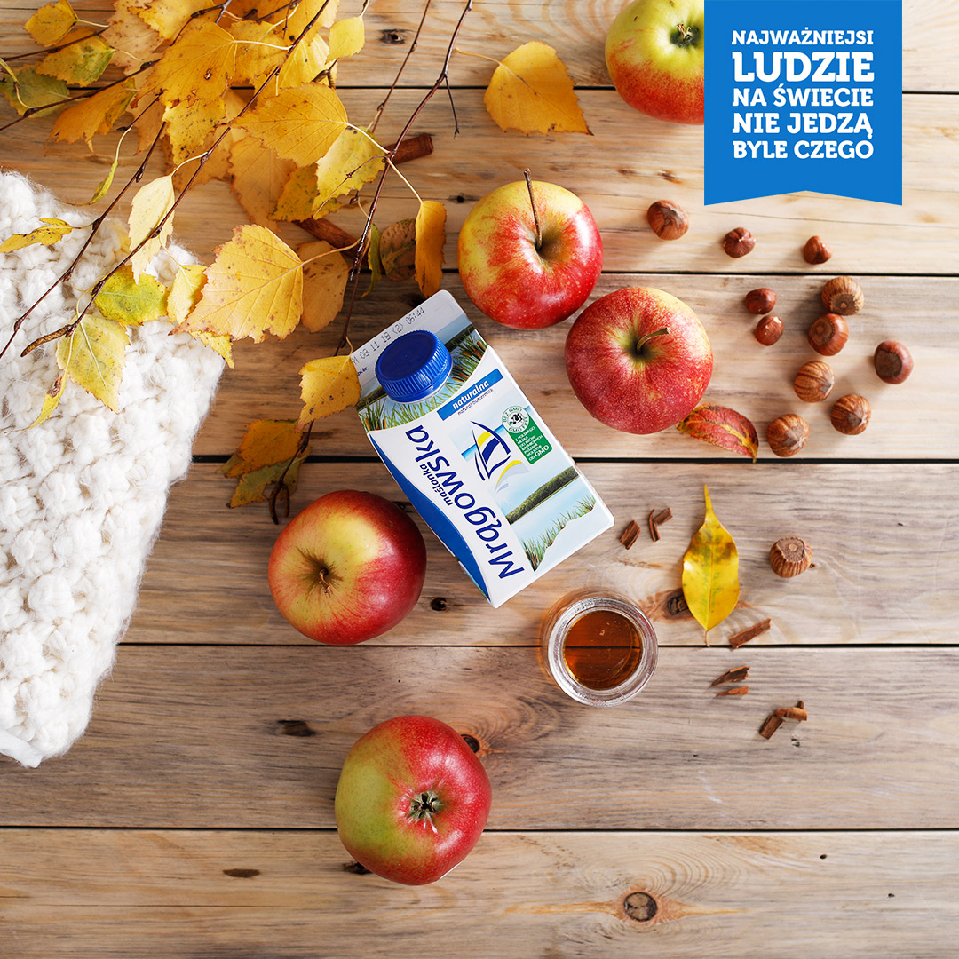 Jabłko pokrój na mniejsze kawałki, usuń gniazda nasienne. Wrzuć owoce do blendera. Dodaj pozostałe składniki i zmiksuj na koktajl. Przelej do szklanek. Udekoruj cynamonem, orzechami laskowymi i miętą.