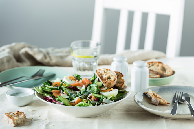 Idealna sałatka na rodzinną kolację lub spotkanie z przyjaciółmi. Maślankowy dressing z cytrynową nutą idealnie uzupełnia smak warzyw i podkreśla łososia. To będzie pyszny wieczór !