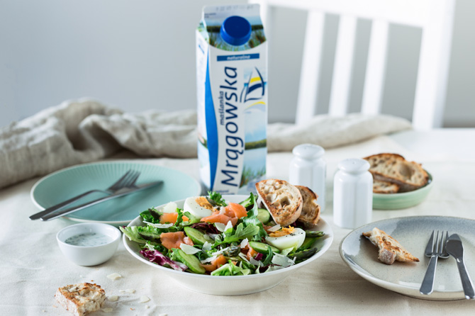 Wszystkie składniki dressingu wymieszaj, dopraw cukrem, solą i pieprzem. Całość dokładnie wymieszaj. Szparagi umyj, odłam zdrewniałe końcówki i gotuj szparagi we wrzątku przez 2-3 minuty. Sałaty umyj, osusz i przełóż na duży talerz. Dodaj pokrojonego ogórka i szparagi, przekrojone na pół jajka i kawałki łososia. Dodaj świeże zioła i wiórki z sera, zrobione obieraczką do warzyw. Całość posyp grzankami i polej maślankowym dressingiem.