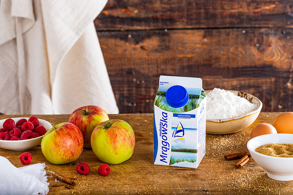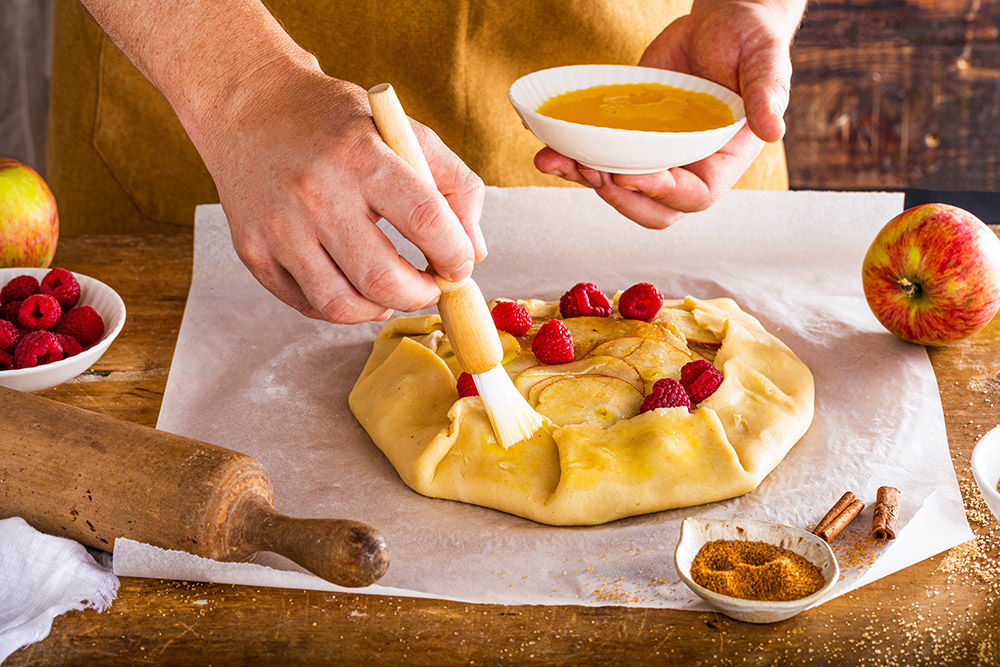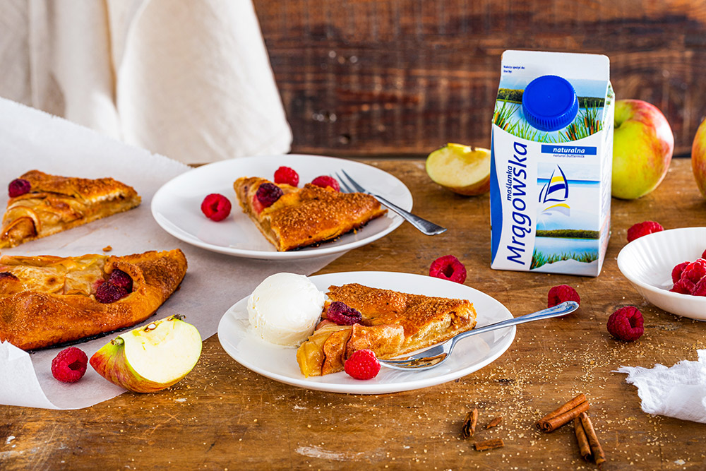 Jabłka kroimy na cienkie plasterki i układamy w okrąg na środkowej części ciasta w kilka warstw. Tak przygotowane jabłka posypujemy cukrem trzcinowym i cynamonem. W kolejnym kroku składamy boki ciasta tak aby zachodziły lekko na jabłka, następnie smarujemy je roztrzepanym jajkiem i posypujemy cukrem. Na wierzch tarty układamy kilka mali. Tartę przekładamy na blaszkę do pieczenia i wkładamy do piekarnika nagrzanego do 190 stopni i pieczemy przez ok. 40-45 minut.