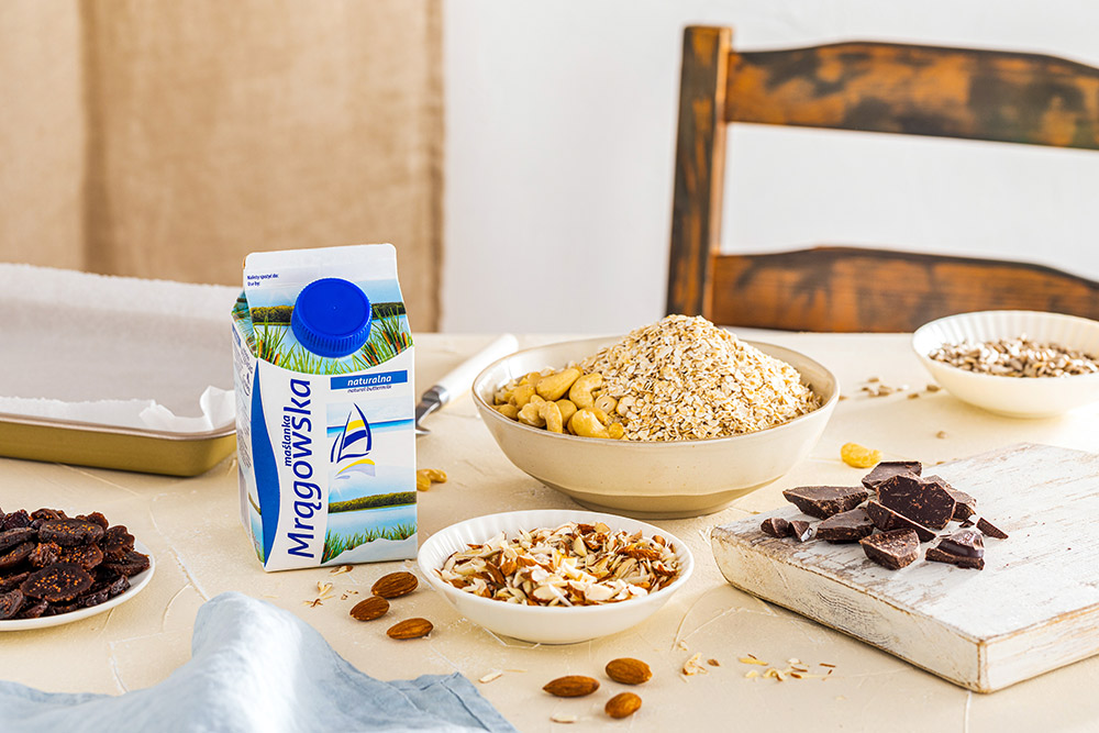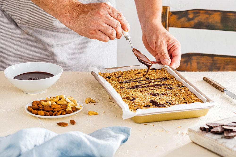 Wcześniej namoczone figi pokroić w plasterki, a orzechy nerkowca i migdały drobno posiekać. Wszystkie mokre i suche składniki wymieszać z sobą w misce do połączenia składników i wyłożyć na blaszkę o wymiarach 32 na 18 centymetrów.
