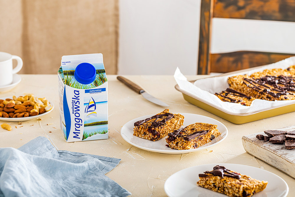Po tym czasie blaszkę wyjmujemy z lodówki i kroimy batony na kawałki. W kąpieli wodnej rozpuszczamy gorzką czekoladę i polewamy nią wierzch batonów.